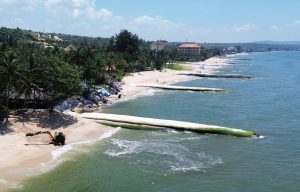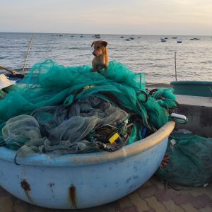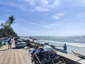 As we walked down what there was of the promenade, there was no sign of a beach, but plenty of fishing boats and fishing debris strewn everywhere. I guess the fisherman were here first, but it was disheartening to see so much rubbish left around. Along the seafront, hotels had attempted to construct makeshift barriers to break up waves and protect what was left of any sand, but these giant tunnel sacks called “Geotubes” completely block access to the sea for guests and create large and dangerous steps for walkers.