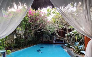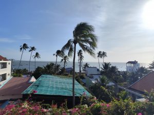 We were relieved to find our hotel room had a balcony with a wonderful view of swaying palm trees with the sea glistening in the distance. This was complemented by a relaxing pool area with huge four poster sun beds, shaded by bougainvillea trees. I could tell where we’d be spending most of our time!